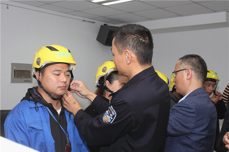 第四項(xiàng)議程,舉行頭盔發(fā)放儀式。請(qǐng)與會(huì)中的5名職工和5名經(jīng)營(yíng)戶上臺(tái)領(lǐng)取和試帶頭盔。